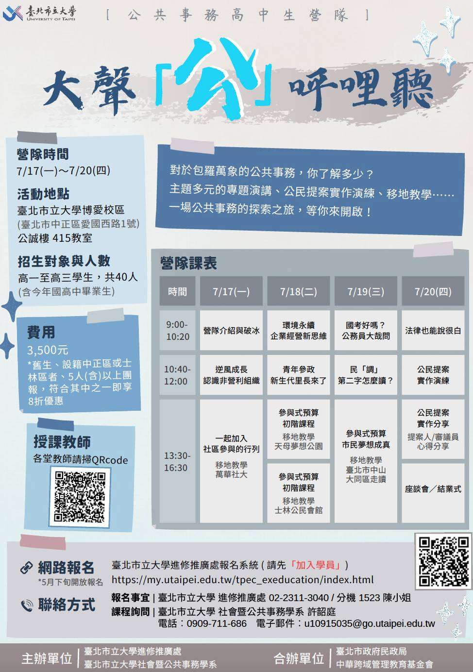 (四)活動內容:帶領學生透過專題演講、公民提案實作演練、移地教學等方法認識公共事務。