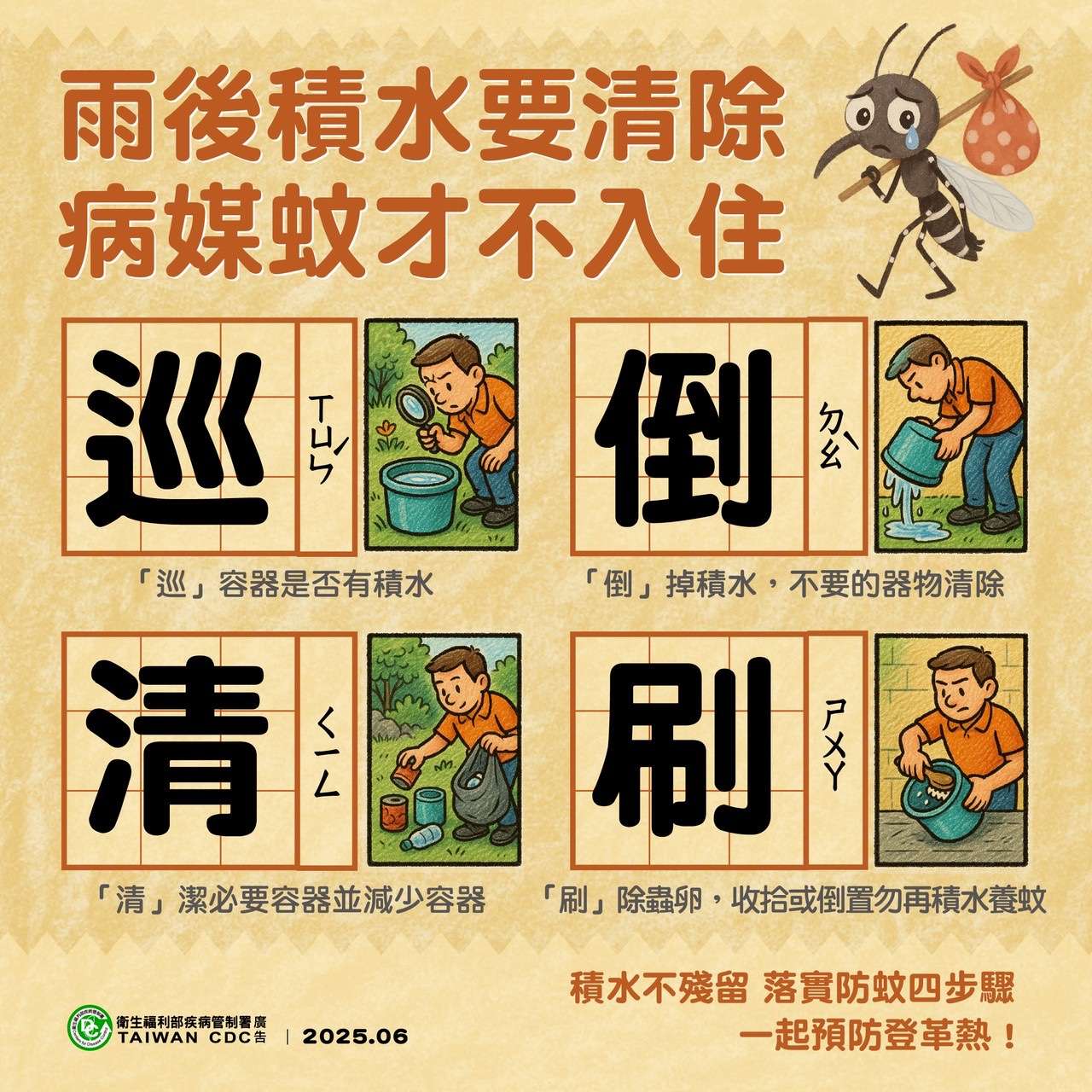 目前正值登革熱流行期,因近期颱風過境後挾帶豐沛雨量,造成部分地區積水或環境中積水容器增加,而風災後一週為登革熱防治關鍵期,請共同落實執行登革熱防治工作。