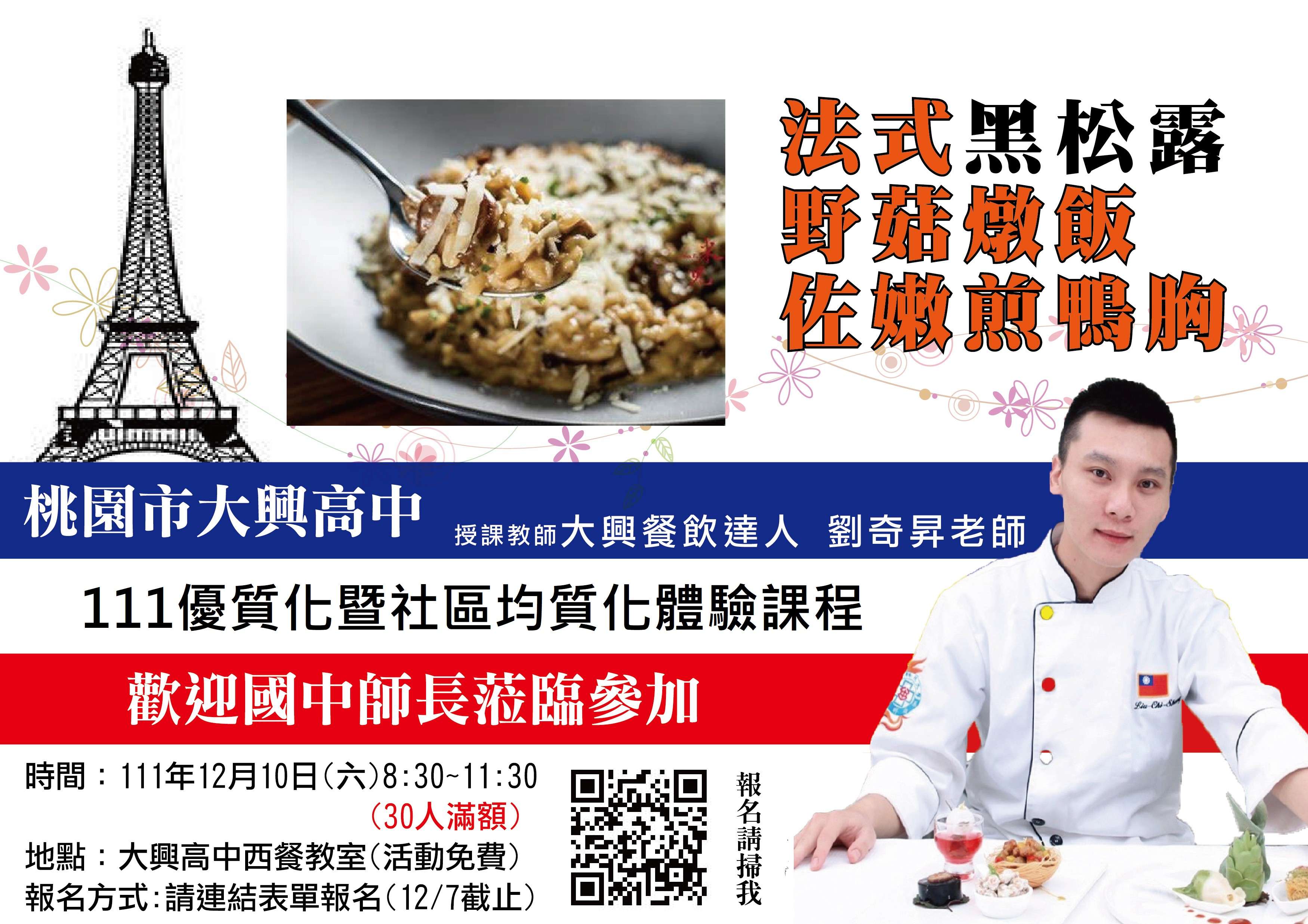 四、地點:上課場地:大興高中西餐實習教室,桃園市大園區永 興路142號。