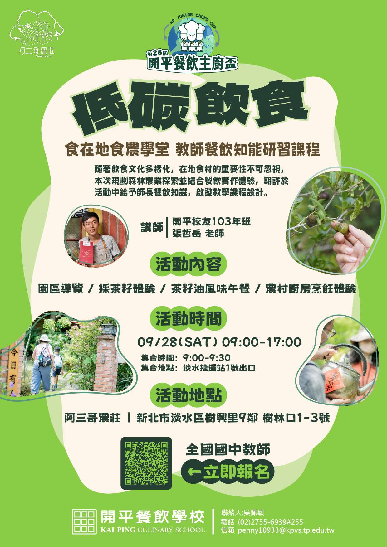 四、報名方式:採線上報名,請上”全國教師在職進修資訊網” 報名,課程名稱:食在地食農學堂-教師餐飲知能研習,課 程代碼:4563267。報名截止日期:113年9月24日 (二),課程名單將於開課前三天確認遴選名單。