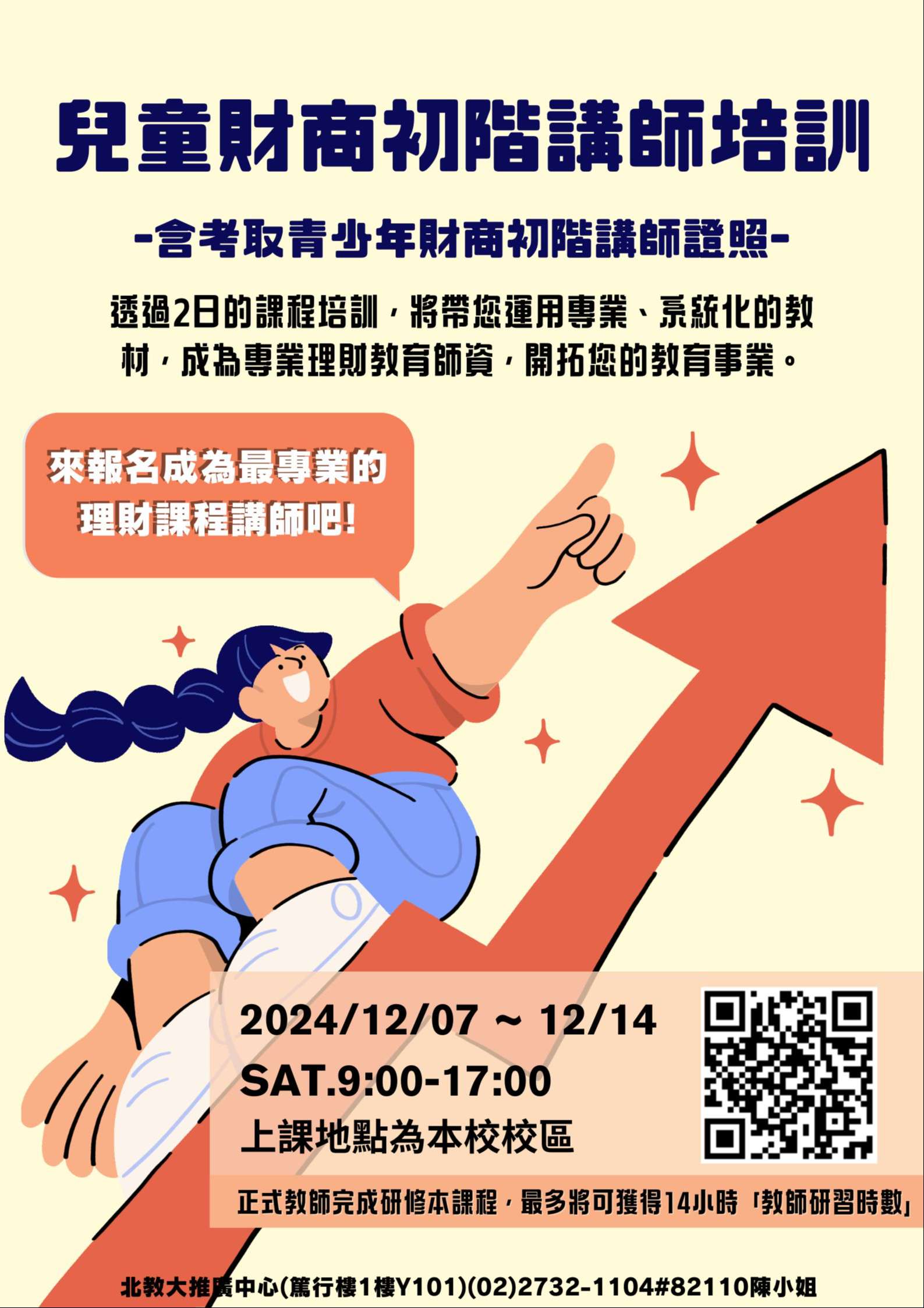 三、兒童財商初階講師培訓班:113年12月7日、12月14日週六9:00-17:00共14小時,現場考取「青少年財商初階講師證照」。在學之大學生或研究生、教育及培訓機構教師、對「兒童財商教育」有興趣之社會人士皆可報名。