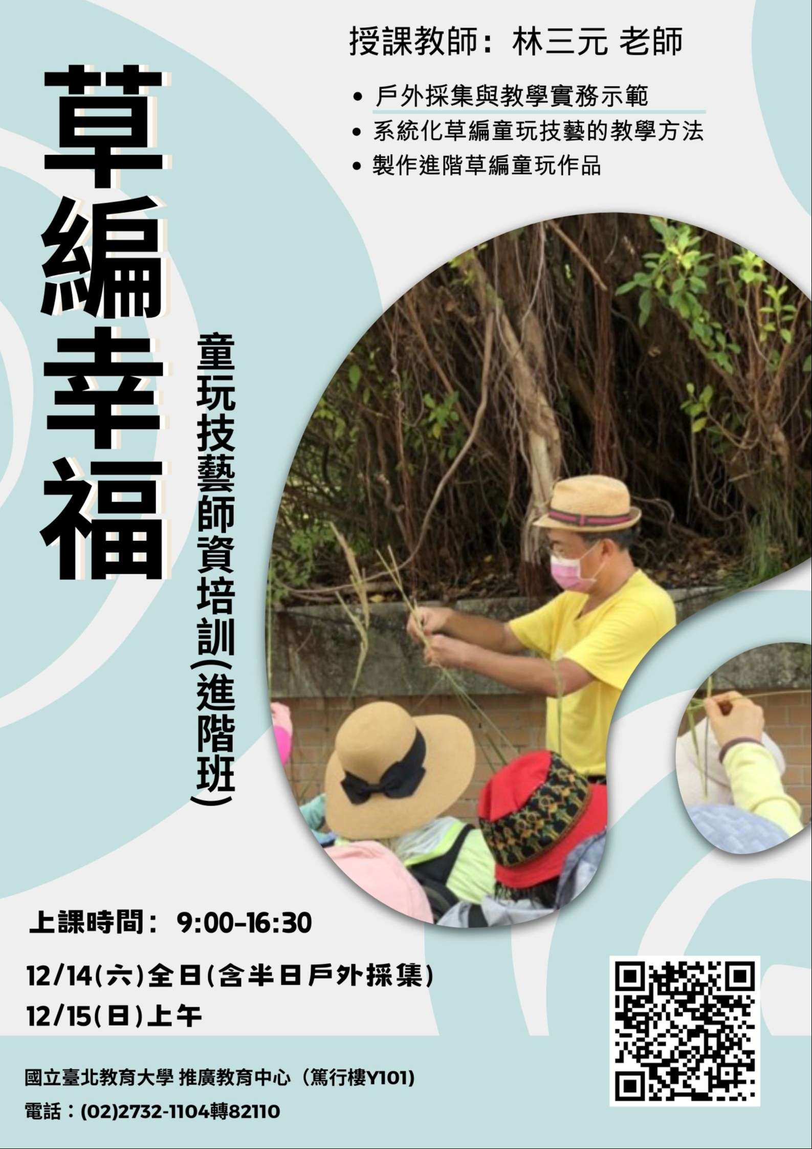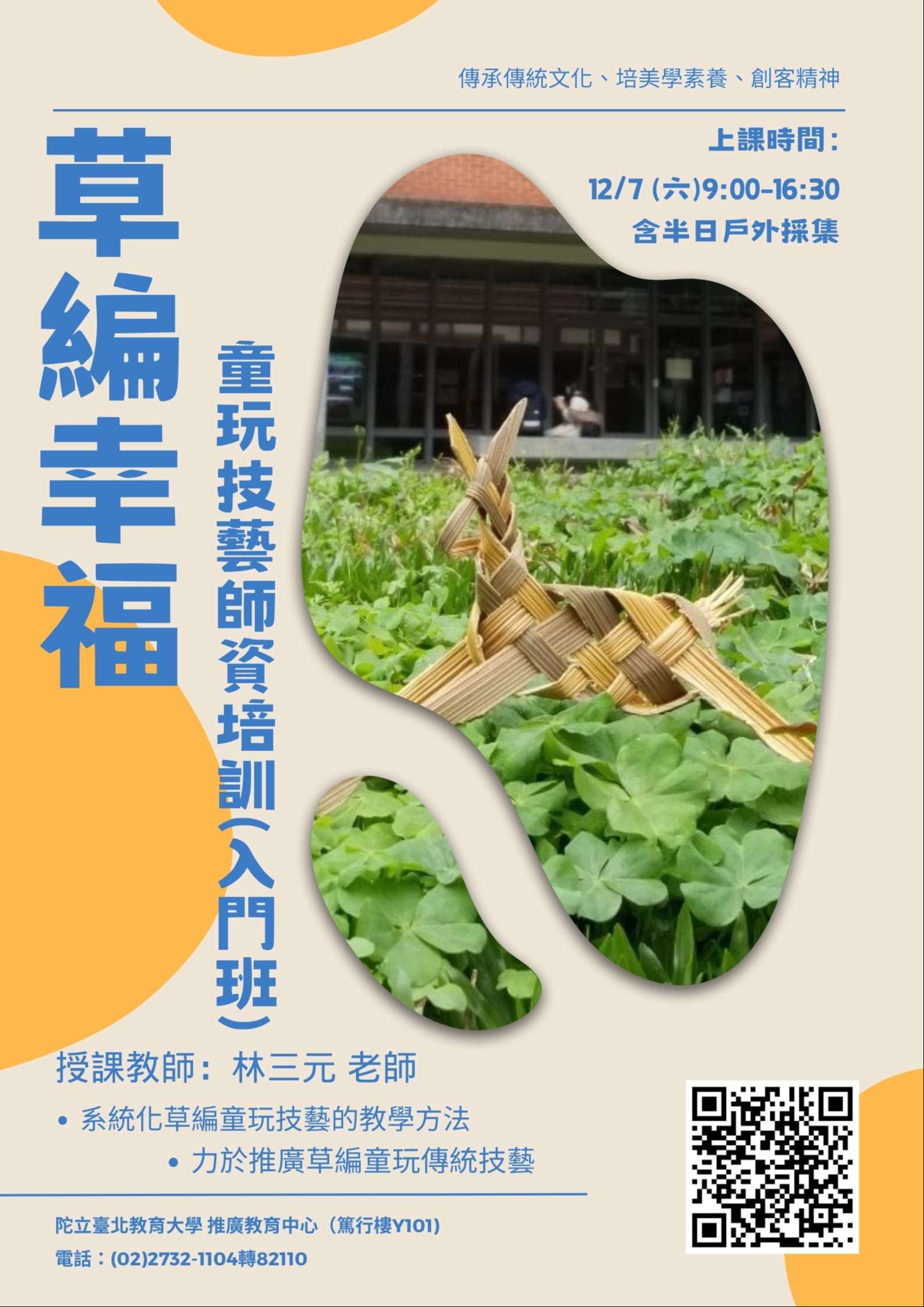 一、草編幸福-童玩技藝師資培訓(入門班):113年12月7日(六)9:00-16:30共6小時,全勤並通過評核將核發研習證明書。課程特聘專業草編達人「草編CEO林三元老師」親授,包含戶外採集、戶外與教室型態的教學示範、草編文化歷史理論介紹,豐富多樣的內容不藏私分享,歡迎18歲以上對草編童玩有興趣之教師或一般民眾報名。