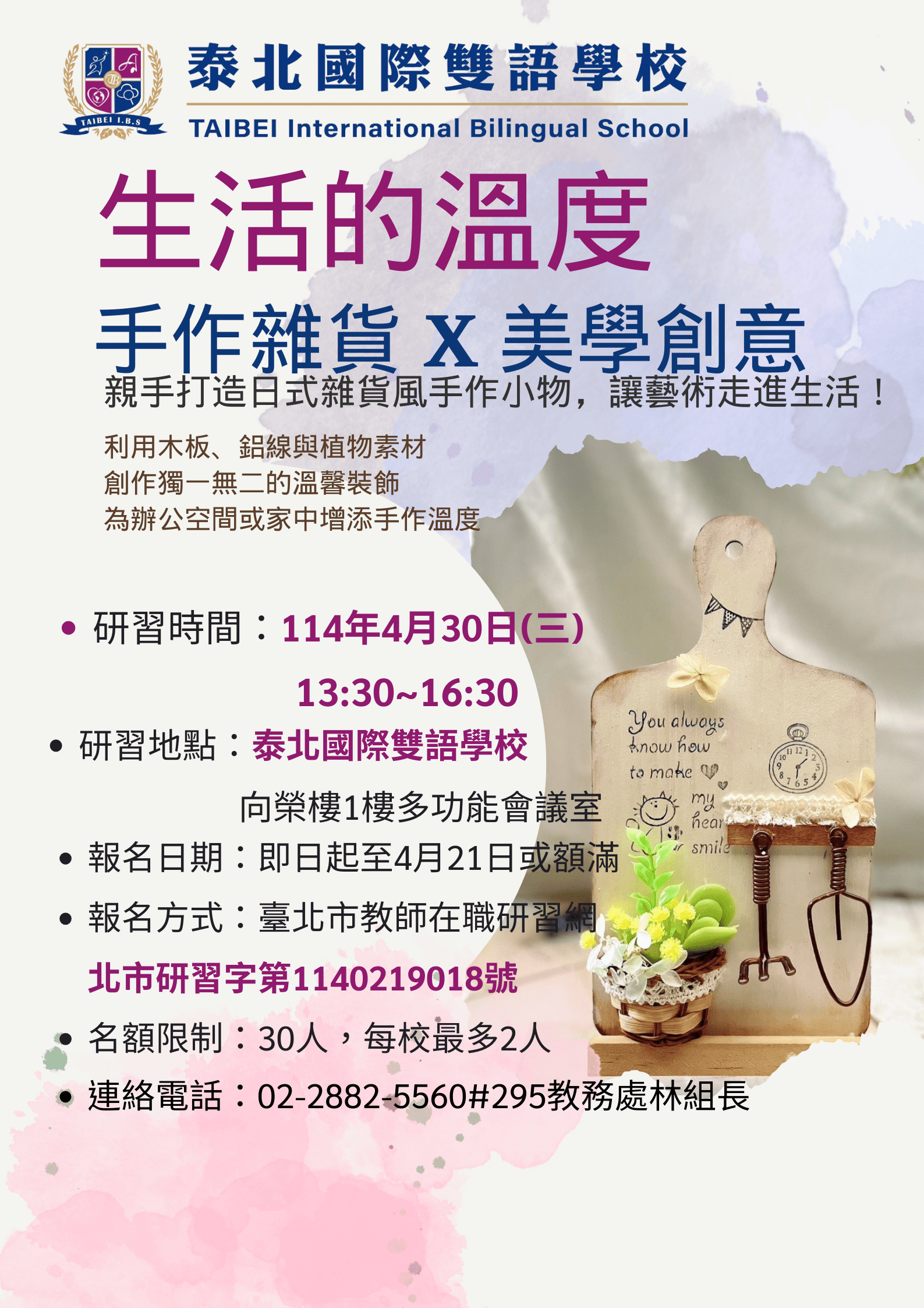 1、研習名稱:手作工藝在生活美學的應用-生活的溫度:手作雜貨 X 美學創意。