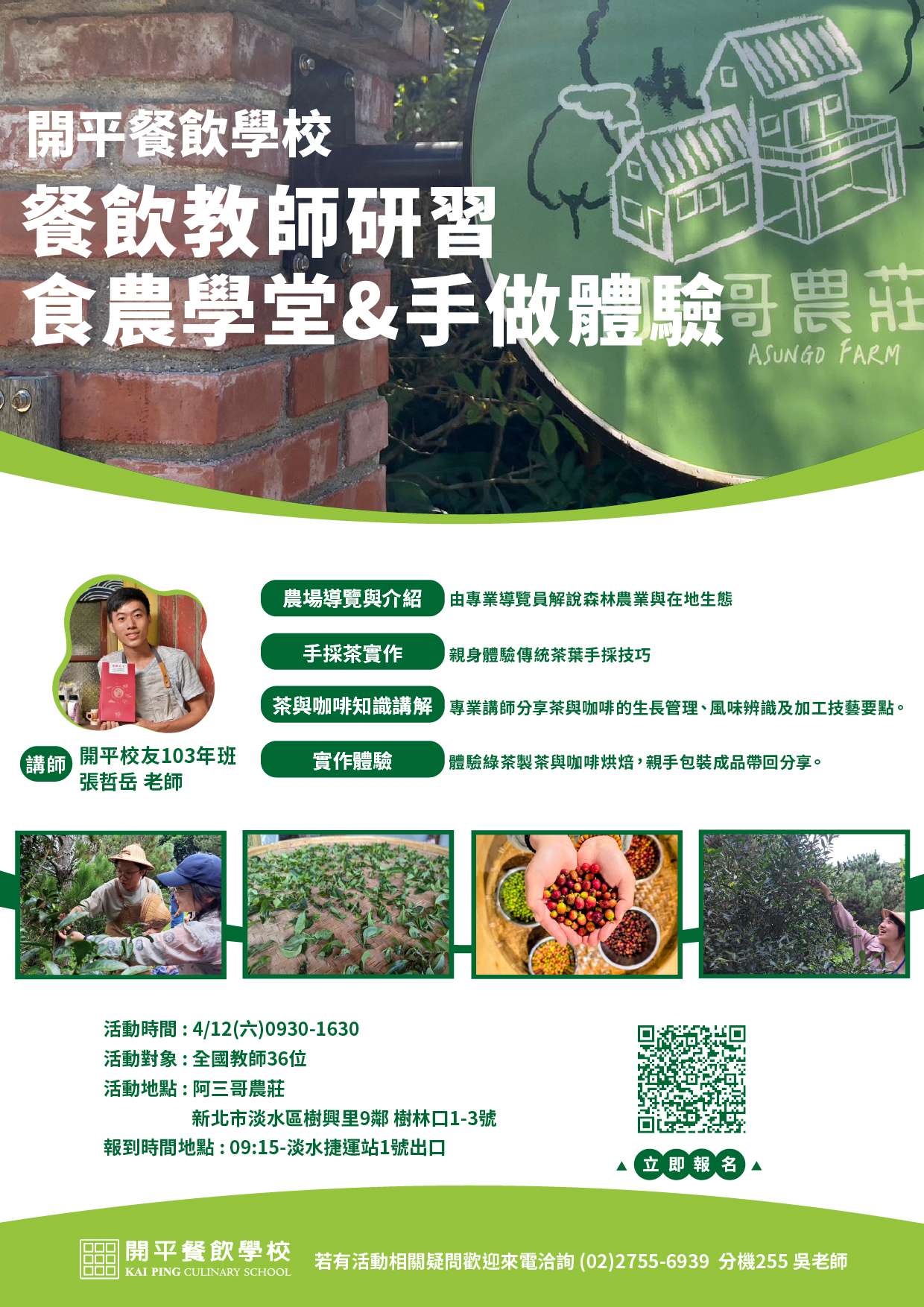 四、報名方式:採線上報名,請上”全國教師在職進修資訊網” 報名,課程名稱:餐飲教師研習_食農學堂&手作體驗,課 程代碼:4919597。報名截止日期:114年04月09日(三), 課程名單將於開課前三天確認遴選名單。