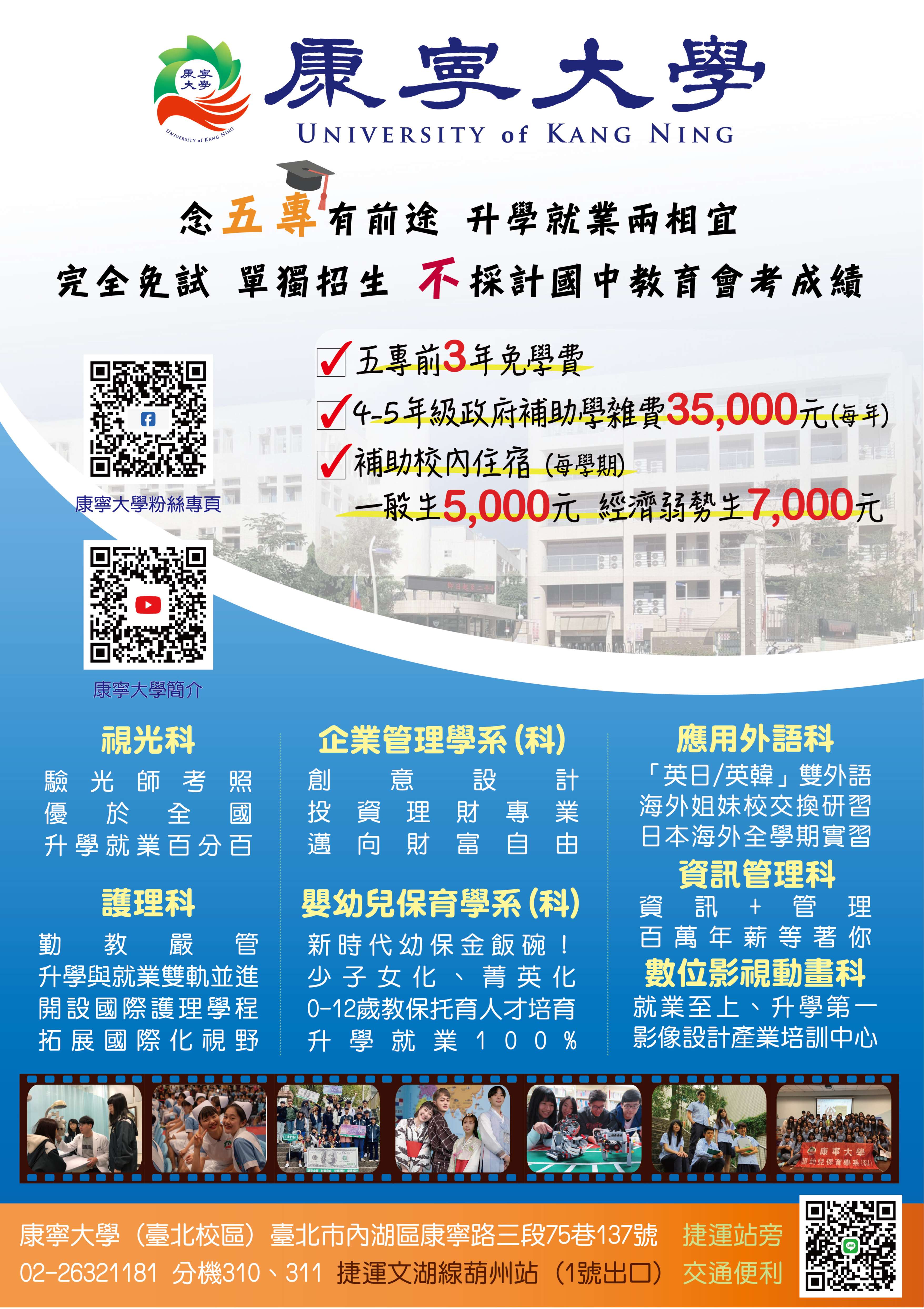 三、本校簡介影片:https://www.youtube.com/watch? v=FZ77bg1xeI0 四、聯絡人資訊:康寧學校財團法人康寧大學教務處招生中心 高惠玲主任 聯絡電話:(02)2632-1181分機310;0916-051-882