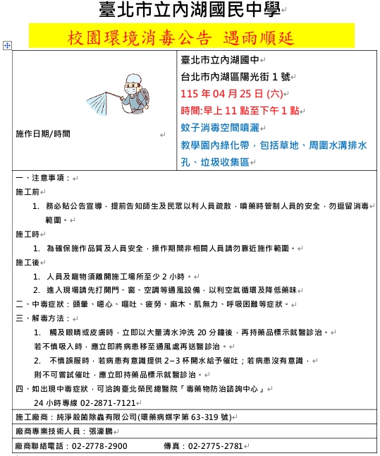 115年4月25日消毒時段若無必要請教職同仁不要到校,感謝配合。