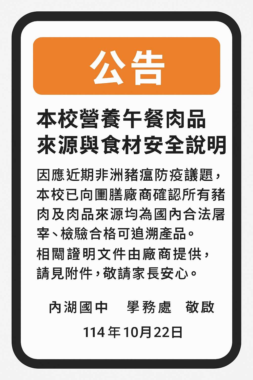 因應近期非洲豬瘟防疫議題,本校已向團膳廠商確認所有豬肉及肉品來源均為國內合法屠宰、檢驗合格可追溯產品。相關證明文件由廠商提供,請見附件,敬請家長安心。