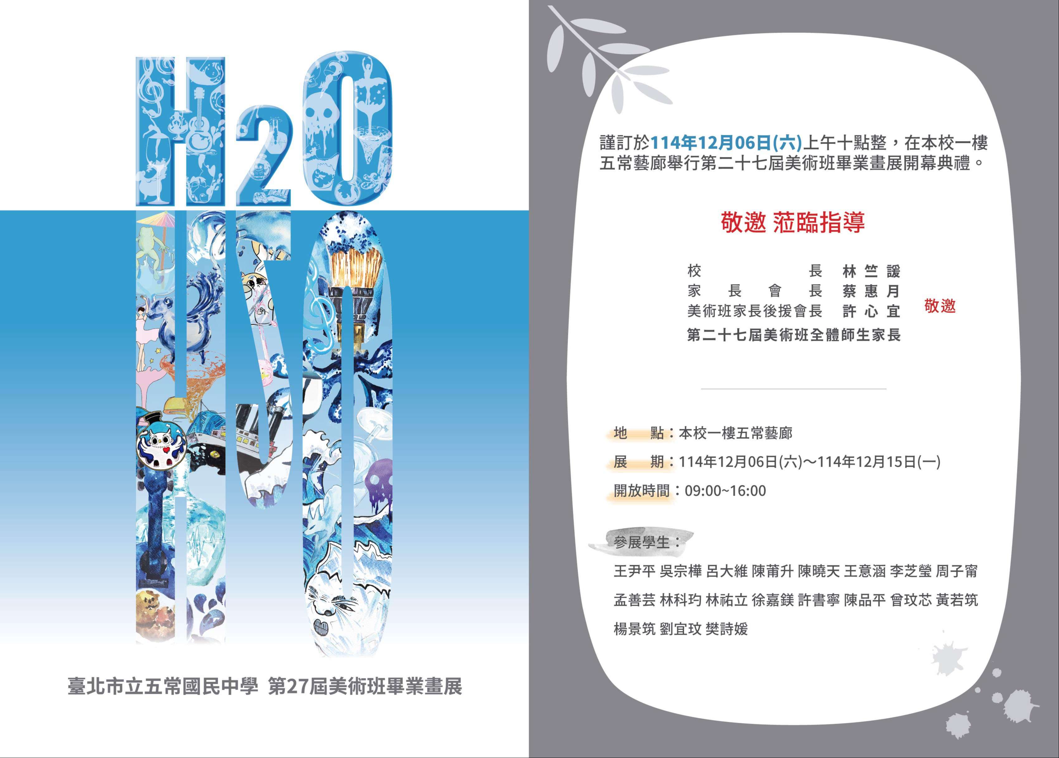 一、該校謹訂於114年12月6日(星期六)舉行本校第27屆美術班「H2O」畢業畫展活動,開幕典禮為上午10時舉行,歡迎各界貴賓共襄盛舉。