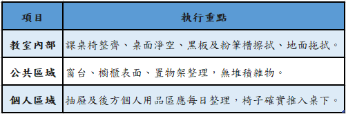 為了在寒假輔導期間擁有乾淨、舒適的學習環境,請大家協力維持教室整潔。以下為打掃區域、時間及注意事項,請務必確實執行: